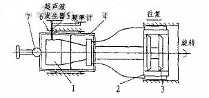 加工坦克發(fā)動機缸套的最后一道工序——珩磨工序的質(zhì)量和精度要求較高,其中要求內(nèi)孔尺寸精度IT6級,內(nèi)孔圓度0.015mm,平行度0.03mm(由上道工序保證),表面粗糙度Ra0.05μm。采用傳統(tǒng)珩磨工藝加工時,產(chǎn)品質(zhì)量不穩(wěn)定,難以達到精度要求。為解決這一問題,筆者研制了直徑f150mm的超聲珩磨系統(tǒng)樣機,采用該珩磨機樣機的缸套試件可滿足加工技術(shù)要求。 1、樣機結(jié)構(gòu)原理 本樣機是根據(jù)兵總616廠的生產(chǎn)要求立項預(yù)研的。樣機的超聲珩磨系統(tǒng)結(jié)構(gòu)見圖。系統(tǒng)由超聲波發(fā)生器、頻率計、超聲珩磨裝置等組成。超聲珩磨裝置由聲振系統(tǒng)(換能器、變幅桿、工具聲振系統(tǒng))、珩磨頭部、漲芯部、動力傳遞部、碳刷、浮動連接部、機殼部等組成,其工作原理是由超聲波發(fā)生器將50Hz交流電轉(zhuǎn)換為超聲頻的電振蕩,由換能器將超聲頻的電振蕩轉(zhuǎn)換為超聲頻的機械振動。由于該機械振動振幅較小,僅為4μm左右,不能直接用于機械加工,因此需要通過變幅桿將振幅放大,并將振動傳給聲振子系統(tǒng),由聲振子系統(tǒng)帶動其上的油石產(chǎn)生縱向振動,從而實現(xiàn)在普通珩磨基礎(chǔ)上附加超聲振動的超聲振動珩磨加工。