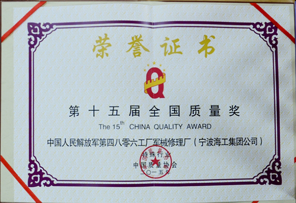 2015年,共有來自全國18個省、自治區(qū)、直轄市的70余家組織申報全國質(zhì)量獎,覆蓋國民經(jīng)濟(jì)26個行業(yè)大類,經(jīng)過嚴(yán)格的資格審查、資料評審、現(xiàn)場評審、工作委員會審議、網(wǎng)上公示、審定委員會審定等程序,評選出9家組織榮獲第十五屆全國質(zhì)量獎,工廠是今年唯一一家獲得“全國質(zhì)量獎”的軍隊(duì)企業(yè)化工廠,也是東海方向及寧波地區(qū)第一家獲此殊榮的企業(yè),樹立了“海工”新標(biāo)桿,提升了“海工”品牌形象。